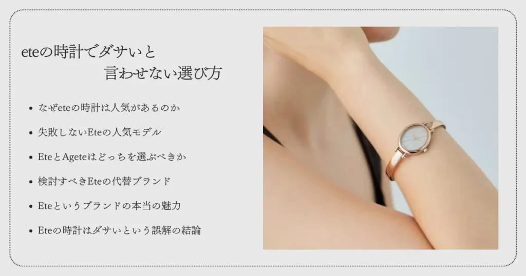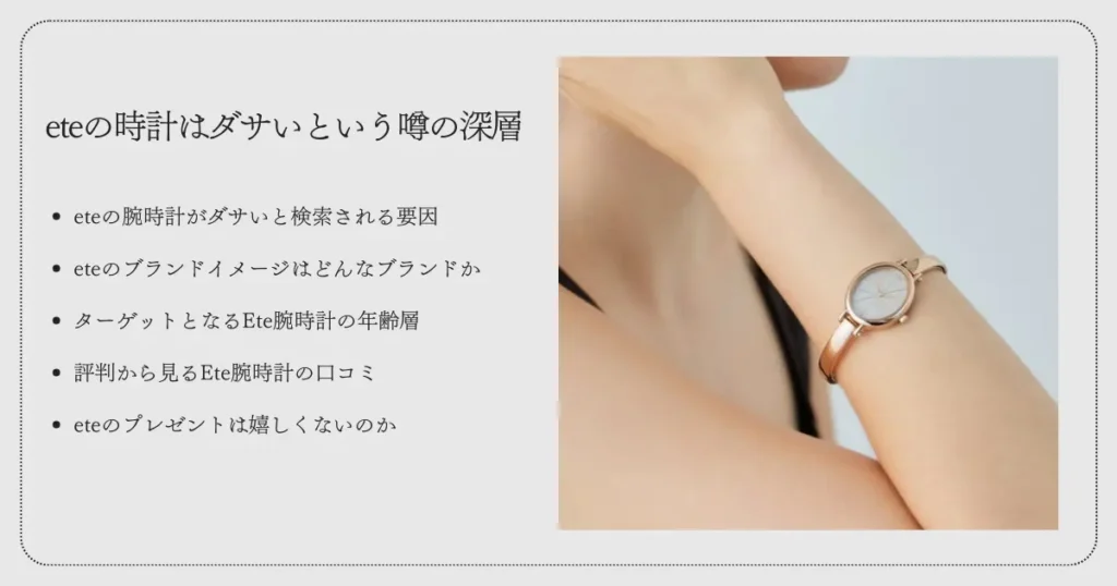 SNSや街中で見かける洗練されたジュエリーブランド「ete(エテ)」。その手元を飾る時計に惹かれつつも、検索窓に表示される「ダサい」などのネガティブな予測変換ワードに、一瞬手が止まってしまった経験はありませんか?