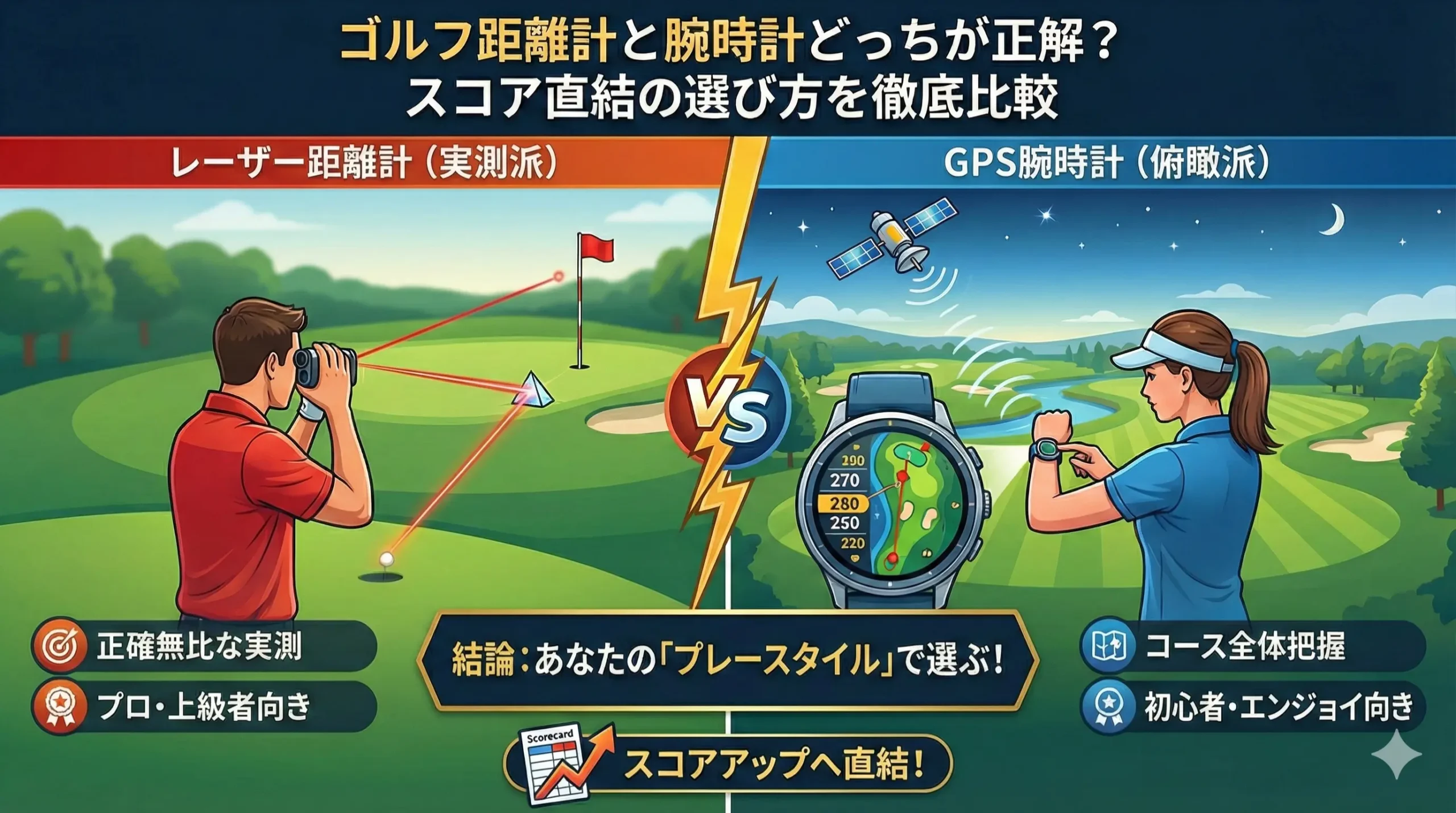 まずは、レーザー距離計とGPS腕時計、この二大巨頭が根本的にどう違うのか、その仕組みと特性を徹底的に比較していきましょう。どちらが「優れている」という単純な話ではなく、あなたのゴルフスタイルにおいて「どちらがよりストレスを減らしてくれるか」という視点で見ていくことが重要です。