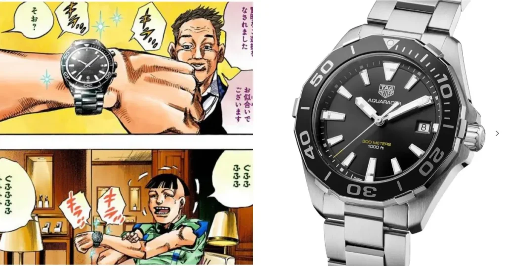 作中、常秀はミラグロマン(お金が増え続けるが使わないと不幸になるスタンド)の呪いから解放される過程で大金を手にした際、高級腕時計の購入を検討する場面があります。そこで彼が購入しようとしたのが、タグ・ホイヤーのアクアレーサーでした。