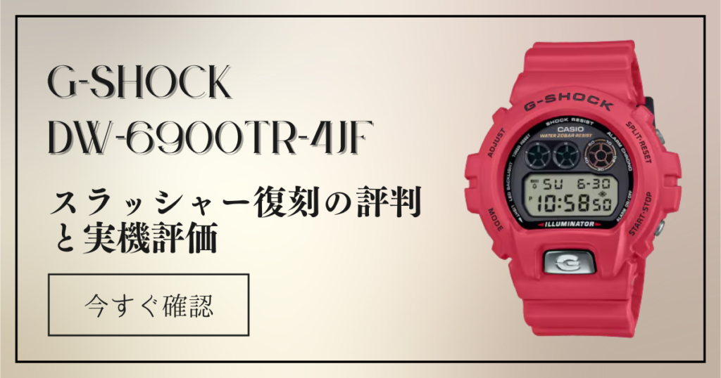 伝説のスラッシャー復刻、DW-6900TR-4JRのレビューや評判を実機目線で徹底検証。30周年記念の赤モデルは本当に買いか?進化した電池持ちやLED、サイズ感など、DW-6900TR-4JRのレビューと評判を網羅し、後悔しない選び方を伝授します。